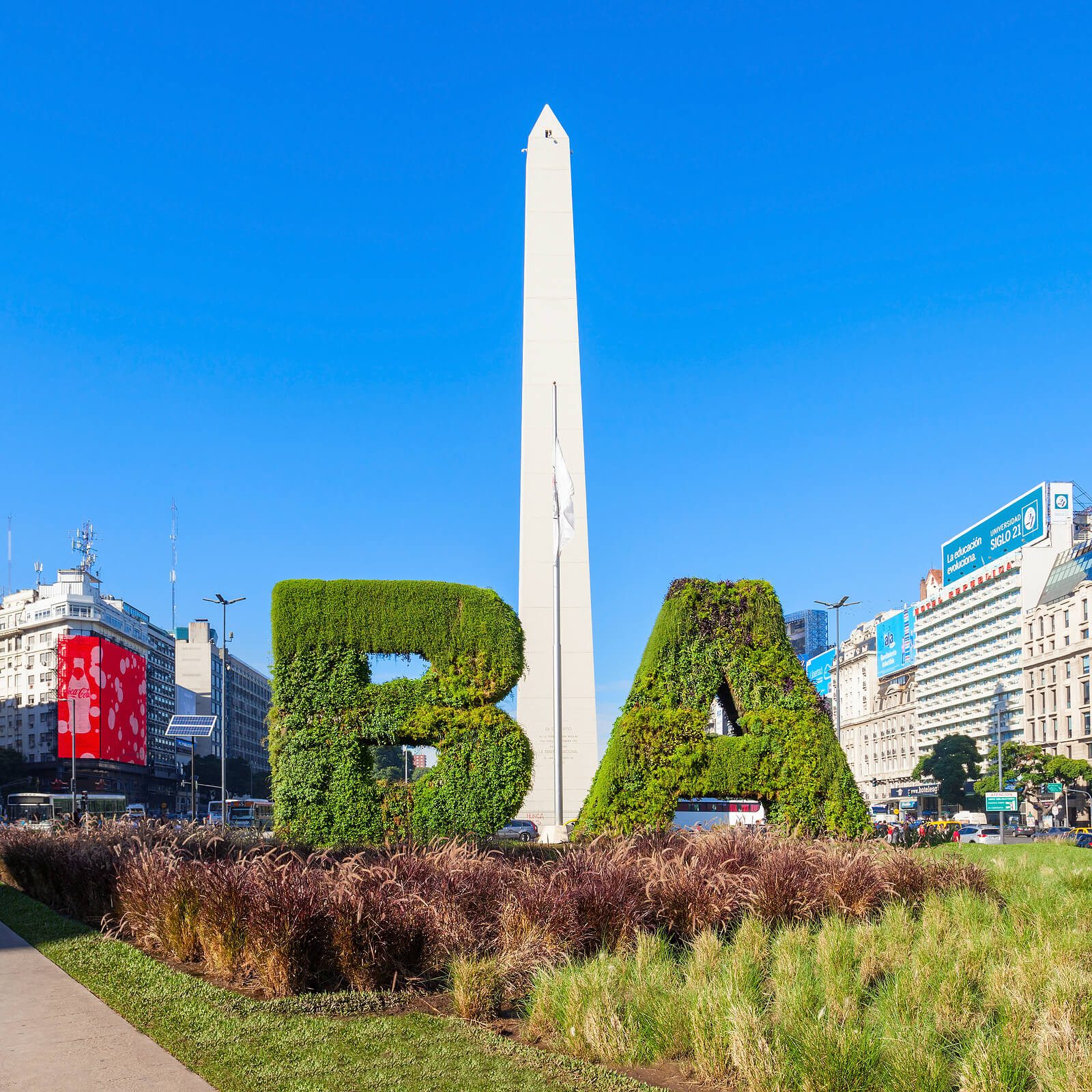 We will then drive along the Avenida De Mayo, which starts from the plaza and along which we will see many wide avenues and green spaces. An example of this will be seen at 9 de Julio Avenue, with its eight lanes divided by small green squares filled with old leaf-filled trees and enriched by sculptures and fountains. In the middle of the avenue, in Plaza de la Replica, arises the Obelisk of Buenos Aires, an icon of the city.
